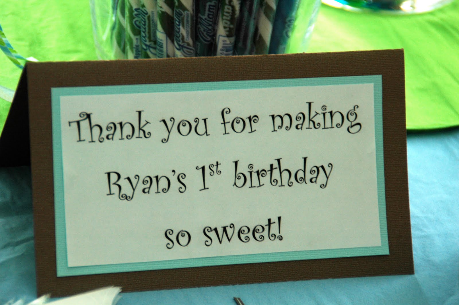 Happy 1st Birthday Ryan!! Summer you rock at cake making! Um I would so not be able to do that LOL.... His smash cake and the regular cake is just awesome! Love the candy buffet!! I was thinking about having one for Kelcee's 4th B-Day!! I love the idea of the sign that says thanks for making Ryan's party so sweet....I may have to use that ha!!